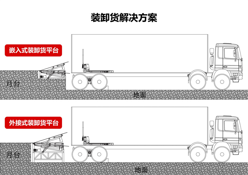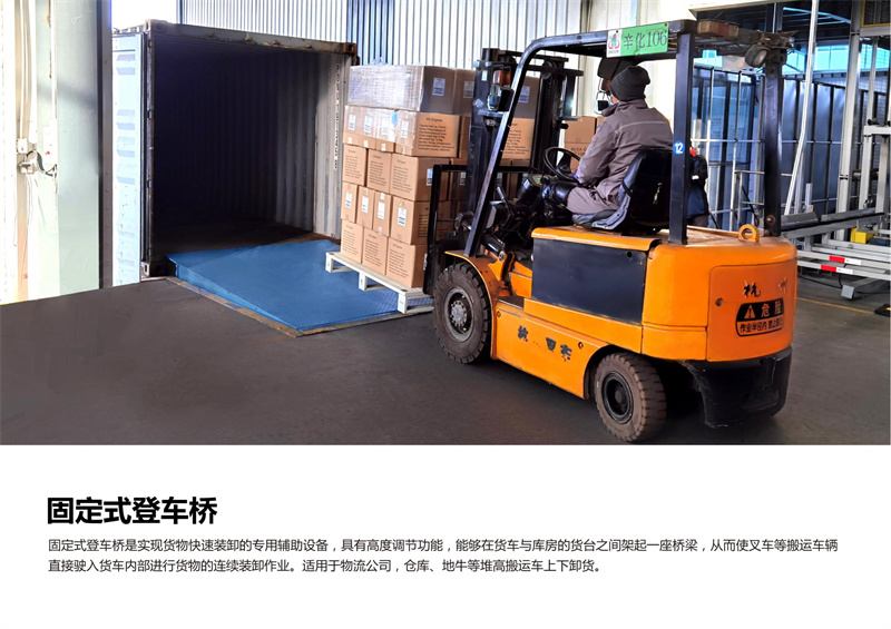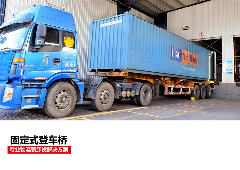 适用场所:产品可根据用户的不同需要,广泛应用于码头、站台、仓库等地。在外形尺寸,承受载荷等方面都可以作特殊设计。固定式登车桥安装在货台的侧面,与货台地面和侧面齐平。固定式登车桥的桥板可上、下倾斜,其外端可高出或低于货台平面,使之与车厢等高。桥板的顶端有一翻板,自动搭在车厢边缘,使货台与车厢平稳过渡。