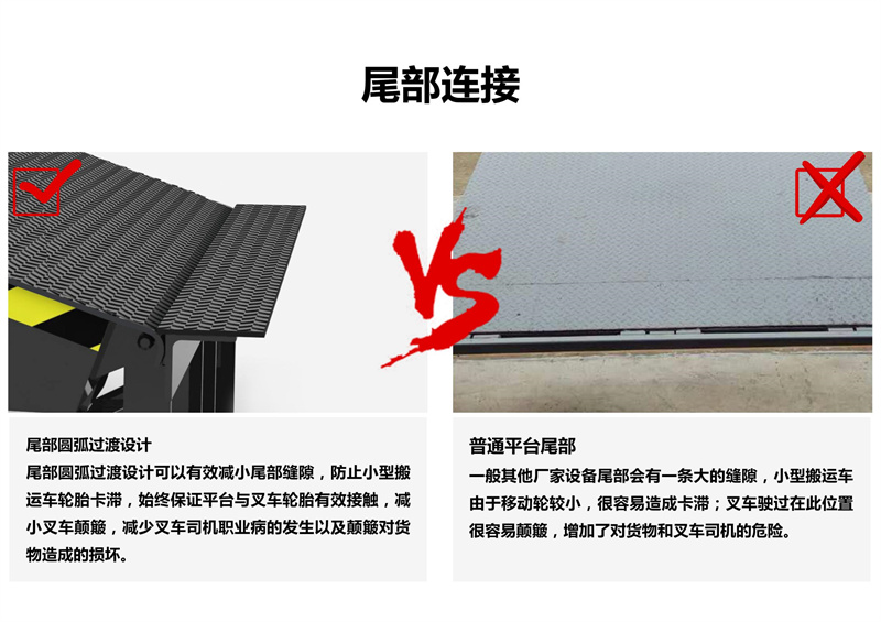 调节板两侧分别有3块活动板,可有效避免调节板下降时压伤脚趾的危险,以确保安全。固定式登车桥调节板底座前面为开放式设计,清理杂物方便快捷。