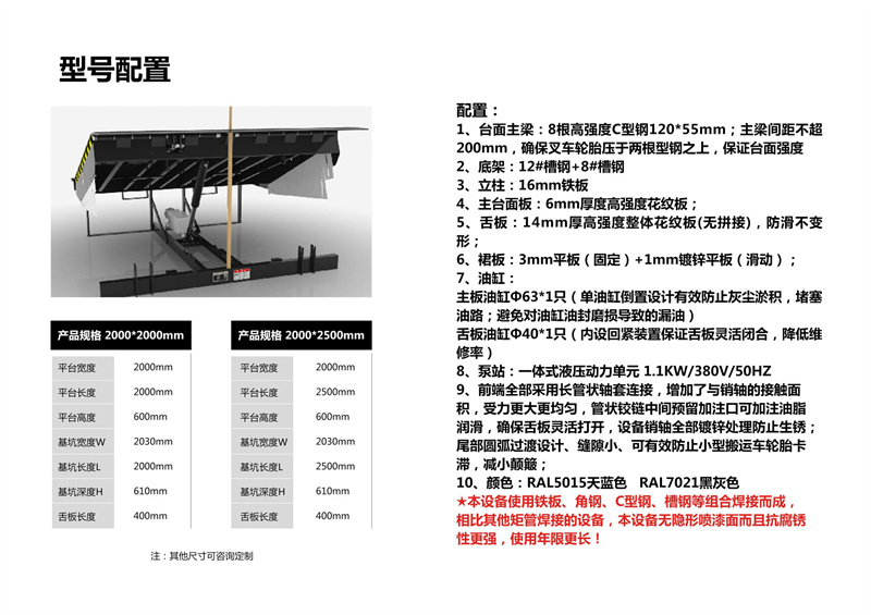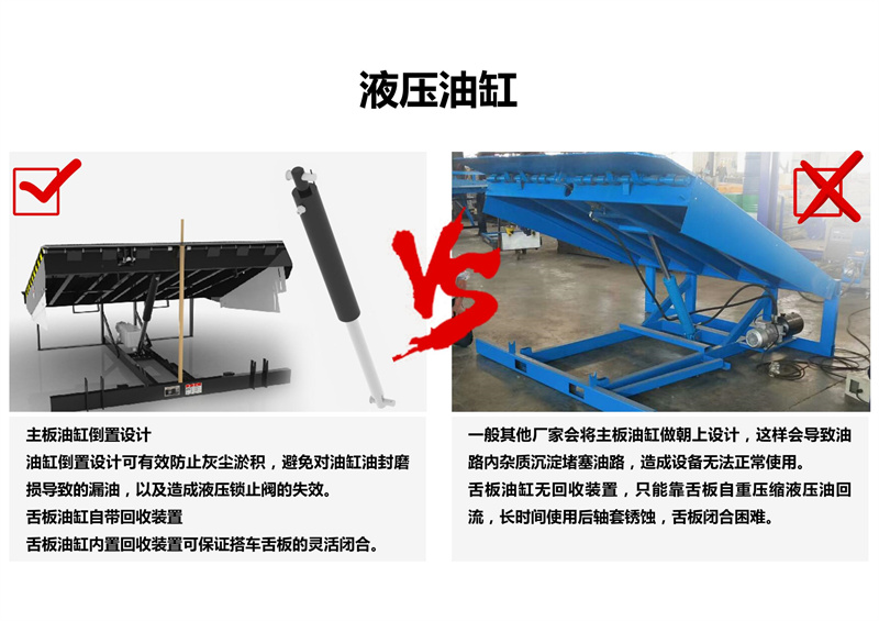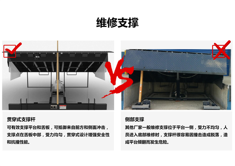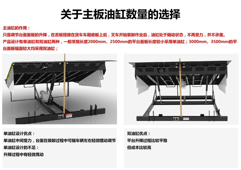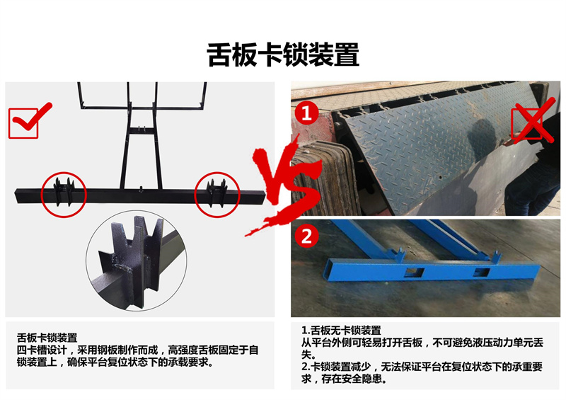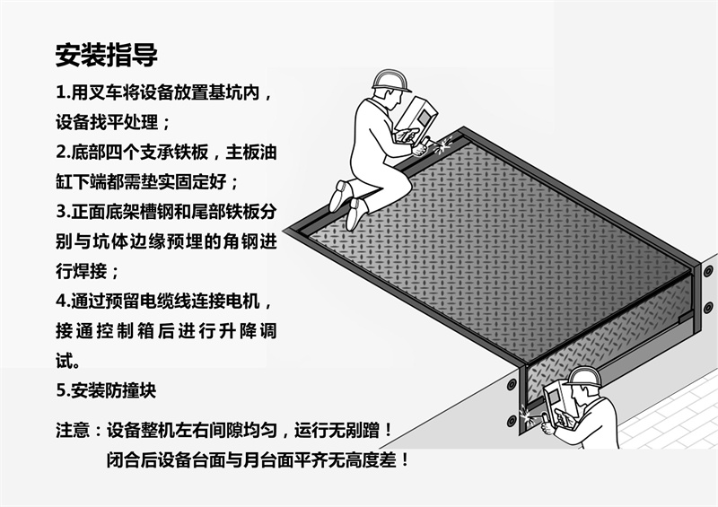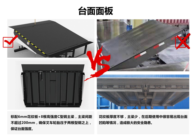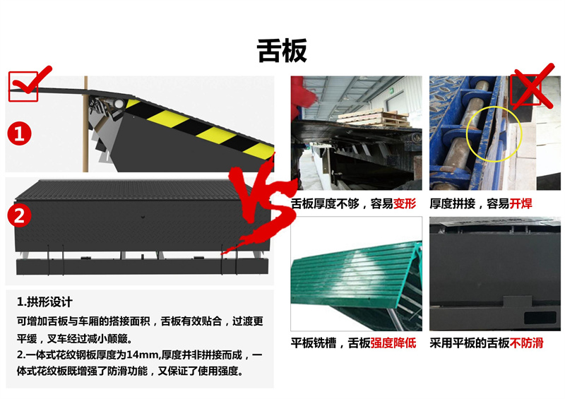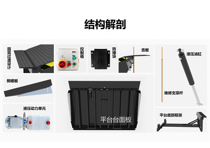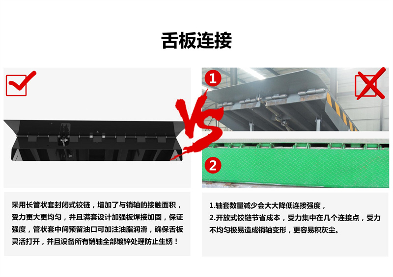 通过动力系统,大油缸升起整个斜板,至顶位时,小油缸开始工作,顺畅伸出活页搭板, 高度调节板全部采用济南济钢优质高度花纹钢板及型材紧密焊接,寿命长久。
