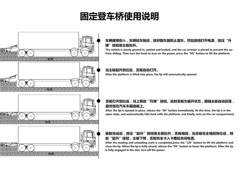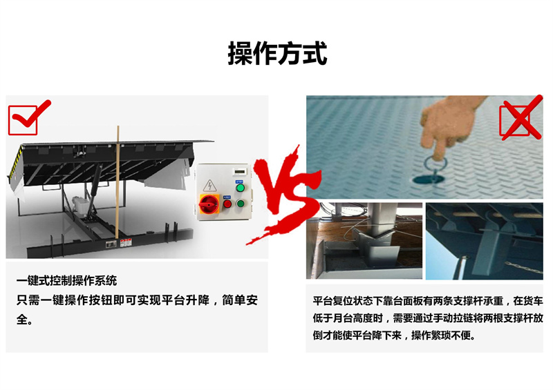 电控操作只需按动按钮,调节板会自动升起,操作极其简单;松开按钮,调节板靠自重下降, 活页搭板搭在货车上即可使用。