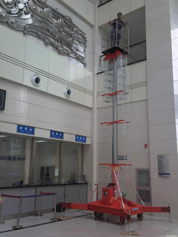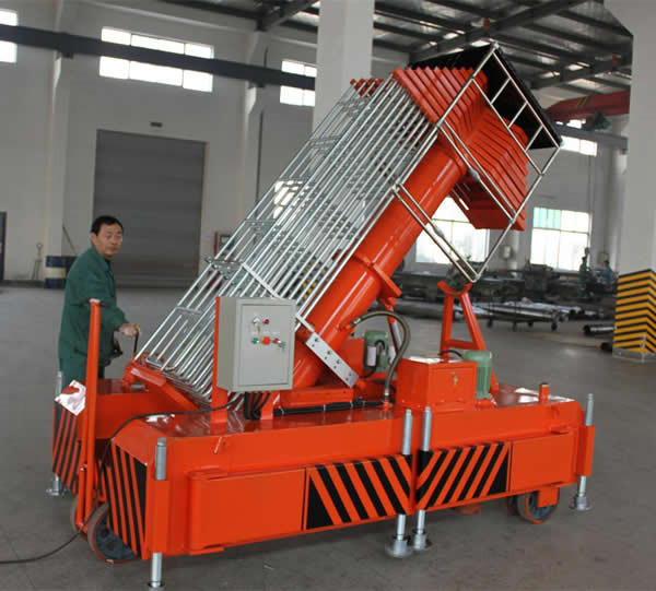 套缸式升降平台具有设计新颖,体积小,外型美观,操作维修方便,升降平稳等优点。整机由平台、伸缩油缸、单梯式或双梯式防转机构、底盘油箱、支腿、行走轮等组成。平台由伸缩油缸直接顶升,当启动电机时,由电机带动齿轮泵供油,油液经单向阀及电磁通道输入油缸,伸缩油缸则逐节上升,当平台升到最大高度时,系统压力也就达到了额定工作压力。